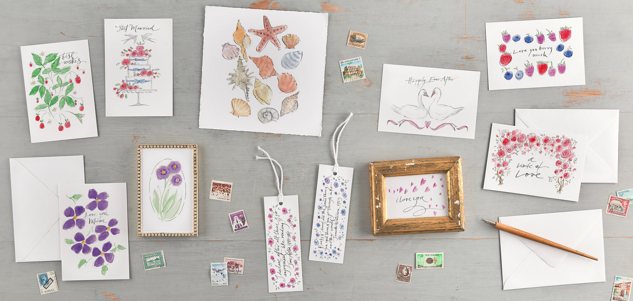 The illustrations and modern caligraphy are originally hand drawn with dip pens, inks and watercolours in loose, free-flowing styles. Pure gold leaf is used to embellish some of the art pieces.