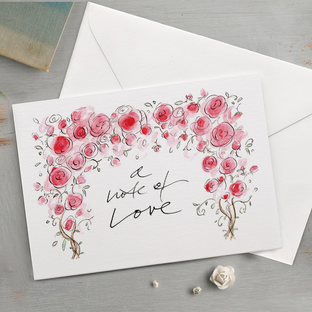 The rose arch illustration was originally hand drawn with a dip pen, ink and painted in a loose watercolour style. The calligraphy was drawn with a dip pen.