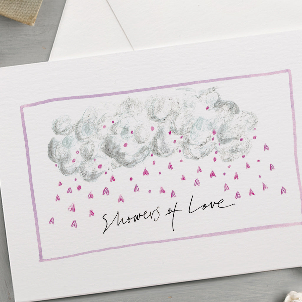 The illustration of storm clouds with hearts was originally hand drawn with a dip pen, ink and painted in a loose watercolour style. The calligraphy script was drawn with a dip pen.