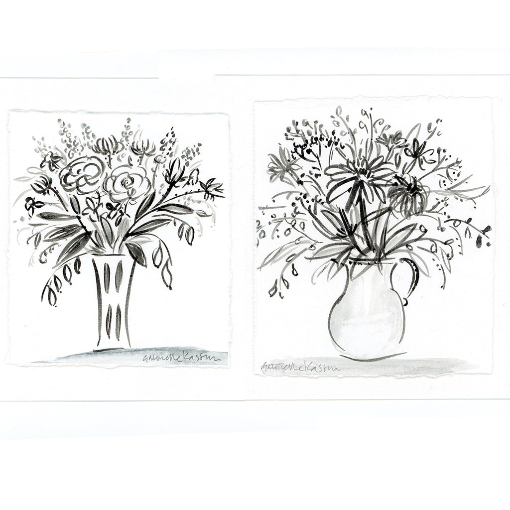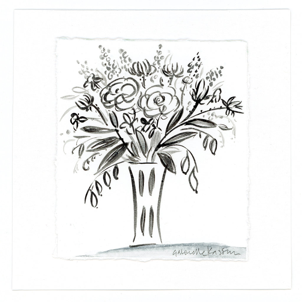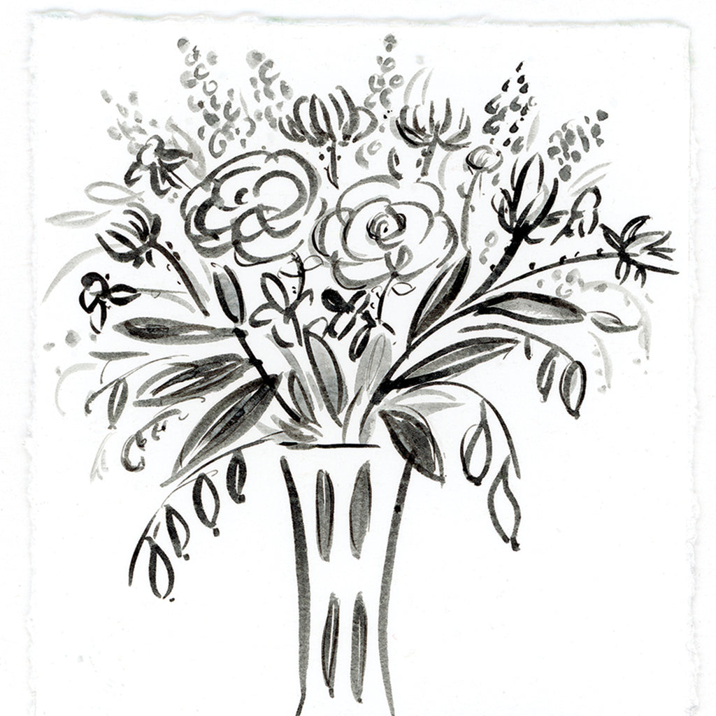 'Vase Of Flowers' is a framed original monochrome illustration. The illustration has been created by hand with ink and watercolour in a loose, natural style. The artwork paper is torn down each side creating deckled edges and mounted on a second piece of the same paper.